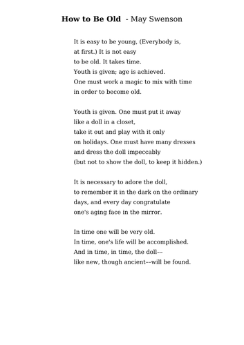 How to be old may swenson. It is not easy to be old. May swenson was born anna thilda may swenson on may 28, 1913, in logan, utah. Living a double life / dual identities.